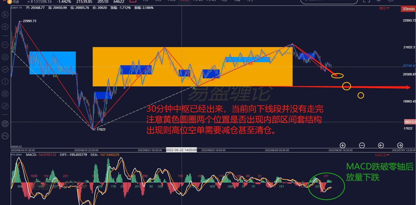 30分钟图看向下线段下跌并未完结,可以清晰看出MACD下穿零轴后处于放量下跌状态。注意如果向下线段内部出现区间套背驰高位空单可以作减仓或者止盈位下移处理。手上空仓的可以等待30分钟买点机会进场。