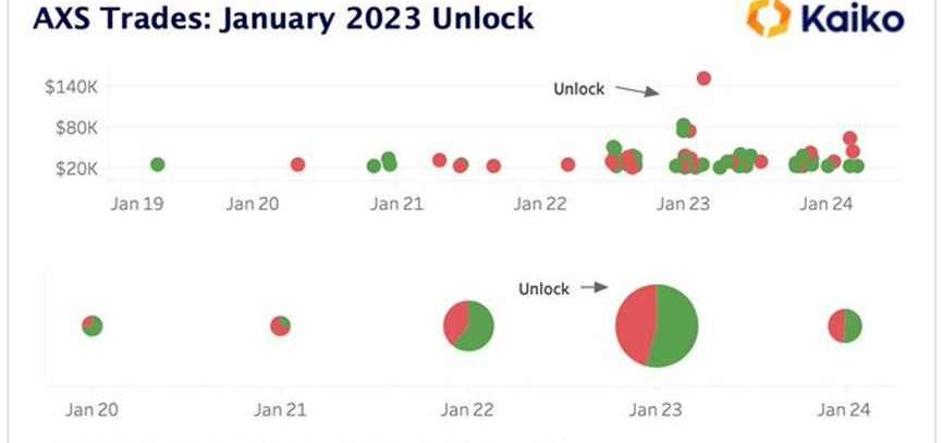 交易层面的数据显示出更有趣的见解去年$AXS解锁释放了8%的上限供应量,其中约四分之一流向了早期投资者导致在解锁当天的抛售压力,在几天后平衡