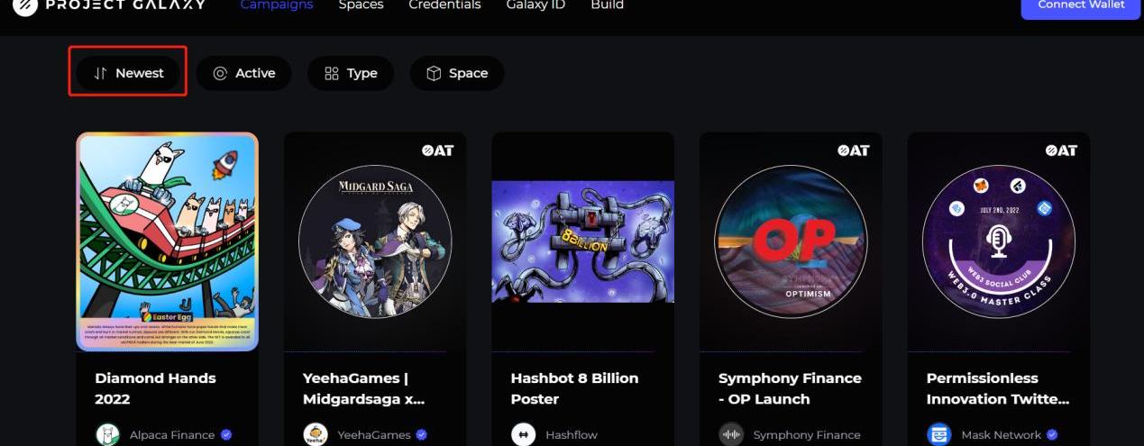 ProjectGalaxy致力于成为Web3世界的链上凭证基础平台,用户连接钱包登入后,即可在“Campaigns”页面看到正在进行的任务活动,点进去后每个任务都有详细的介绍说明,包括活动介绍、活动时间、获取奖励的资格等,用户可以点击“Newest”来查看最新的活动。
