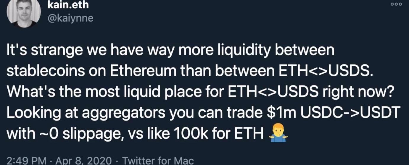 现在,你可以很容易地说:“我们终于在2020年拥有了价值数亿美元的DEX流动性,那你们什么时候会满足呢?”答案是“永不”。但我们在稳定币及封装/合成资产上拥有更好流动性的真正原因,其实是Curve。然而,所有的Curve池都是孤立的,这意味在今天,你可以在链上几乎无磨损地互换2000万美元的USDT和USDC,或者是WBTC和sBTC,但你没办法在不产生明显滑点的情况下从USDT交换成WBTC,这就是我在上面的推文所表达的。