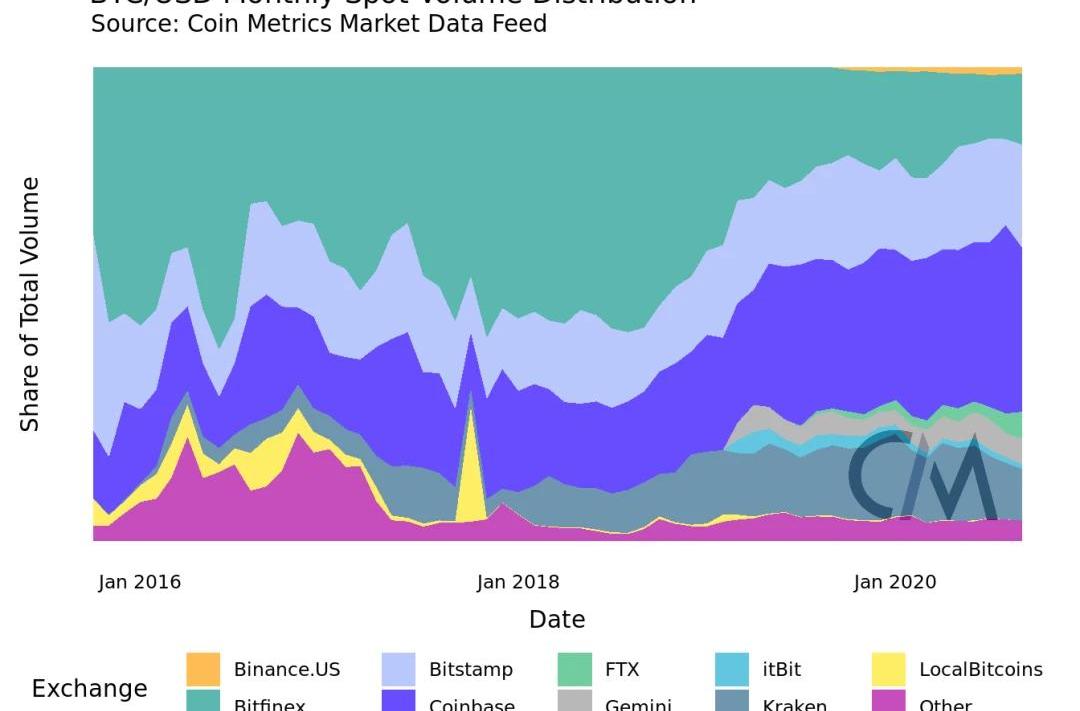 与矿工相比,交易所对比特币去中心化的直接影响较小,因为矿工的作用已写入协议中。不过,作为获取和使用比特币的主要市场,它们对网络的影响也是巨大的。交易所之间的过度中心化,会使市场在破产时面临系统性风险。在加密货币领域最著名的例子是2013年Mt.Gox危机。通常合并也会增加审查的可能性,从而否定使用比特币的一个主要好处。作为从货币到比特币的主要通道,BTC/美元市场在这方面尤为重要。虽然最近稳定币作为一种替代性的报价资产出现,但法币网关仍然是新资本进入市场的重要途径。虽然有几家交易所都提供BTC/美元市场的交易,但该领域通常由几家大公司主导。