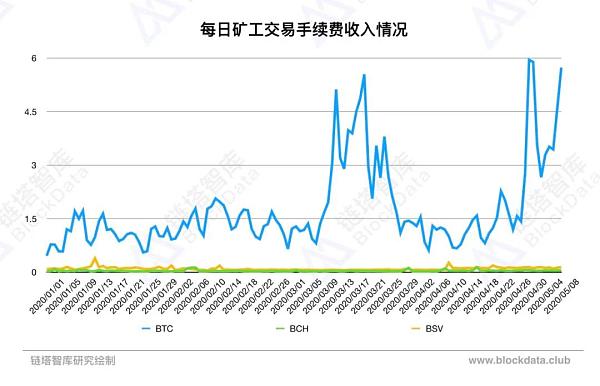 自3月12日暴跌之后,算力至3/20日到达低点也就是85E,而目前BCH或者是BSV上的算力依旧太少,从算力变化来看,替代并不明显,所以链塔智库对于减半完之后算力的变化预计在价格保持8000美元以上水平时,总算力应有80E左右。减少的算力应大多来自于淘汰老旧矿机。白皮书中的预言:交易手续费会变成矿工的收入核心。这一预言目前来看可能性较低,但存在进一步上升的空间,应该能弥补一部分区块奖励减半的损失。