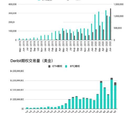 ??灰色的数据是以太坊,绿色数据是比特币,期权张数的增长可以看到从20年6月开始,每个月数据增长很快速,特别是9月的数据非常大,因为是季度的交割的大月份。预计到今年年终的时候,相较去年年终,数据可能翻一倍不止。这样的数据像是18年合约市场的变化,18年是合约年,但到了2020年,我觉得是明确的一个期权年,因为市场增速非常快。